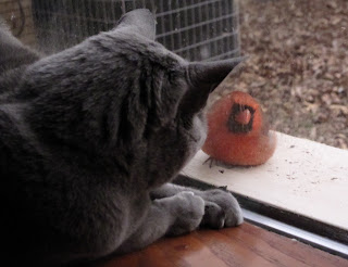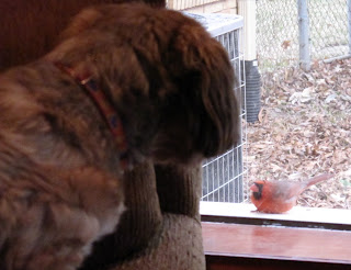 While we were at their house we noticed the cardinal which routinely runs into the picture window ... I mean every ten minutes for several hours a day! Buster also noticed and in this picture was growling at the stupid bird.