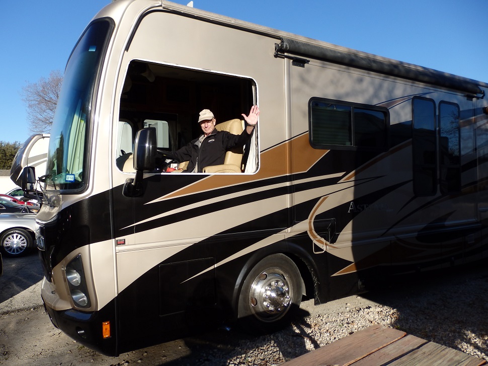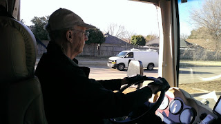 Here's the pilot waving happily as we headed down the road on a 50 degree morning with our new convertible bus! We got a lot of waves as we went through town and even the guys at the repair shop were impressed that we drove it about a half hour over there like that.