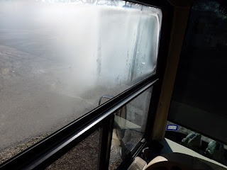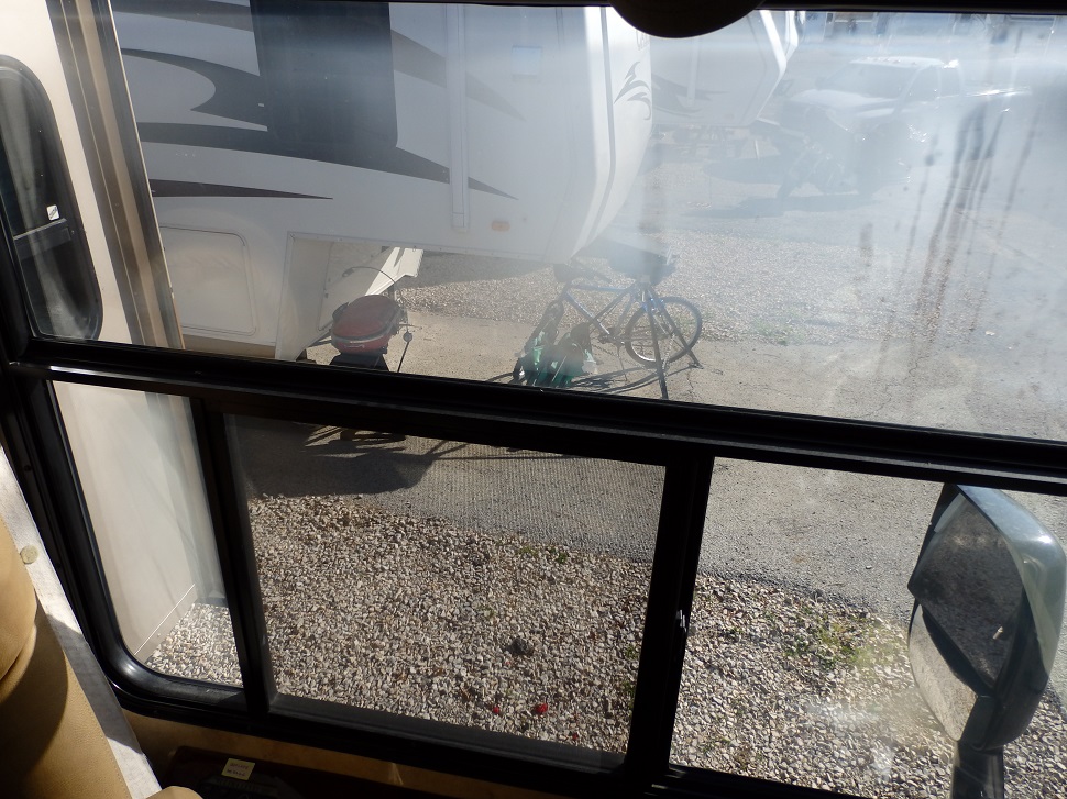 The Thermopane windows aren't really suited to RV life as the constant motion and severe temperatures break down the seals prematurely resulting in a really bad window as you can see from the driver's perspective below.