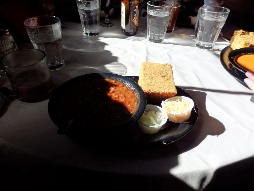 At the top at the ski lift area we took our friends to the Iron Door Café ... yes the ski lifts and skiing were in use and neat to watch. We've been coming to the café for many years because there is nothing better on a hot day down on the desert than to come up here and have hot chili and corn bread and watch the skiers. Even though this place has a captive crowd to partake, every item on the menu is well done and served by some really great folks.