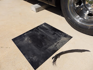 After we limped into the Outback RV park using the back roads, the Goodyear guy showed up and by 8pm that night had replaced both tires on that side for $1535. The Outback park has some nice paved pull thrus which made the replacement easier and the bus, Indy style, raises itself up off the ground on the levelers which is handy. Super service by both Goodyear and the Good Sam folks who had arranged everything. The above pictures obviously were taken later on a good piece of concrete ... and oh yeah, that's a piece of shredded steel belted radial which I later found in the front of our car.