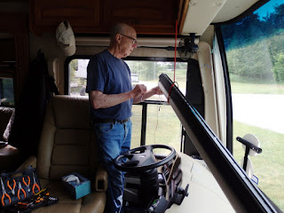 Oops the next project. On the way up here this year the motor in the sun shade by the windshield quit and we had it replaced in Elkhart. Now the motor in the night shade quit working as well. We ordered a new one from the folks at MCD in McKinney where we had some other shade work done and then proceeded to replace it ourselves. It took a couple of hours, a bungee strap, some pounding, and the rewiring to have a functional dual shade again.